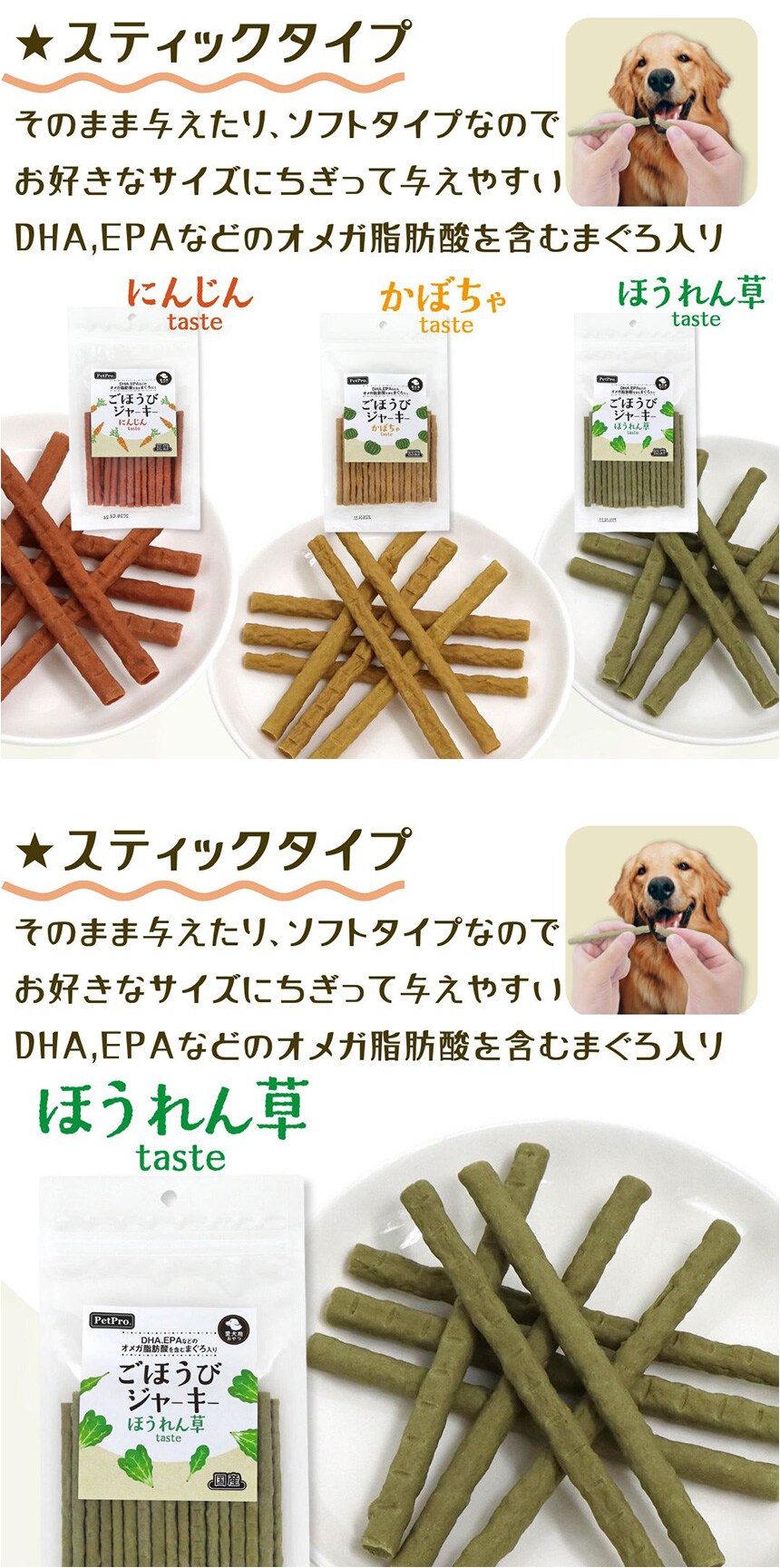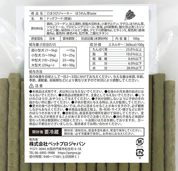 [24個]ペットプロジャパン ペットプロ ごほうびジャーキー ほうれん草taste 100g | DHA、EPAなどのオメガ脂肪酸を含むまぐろ入り