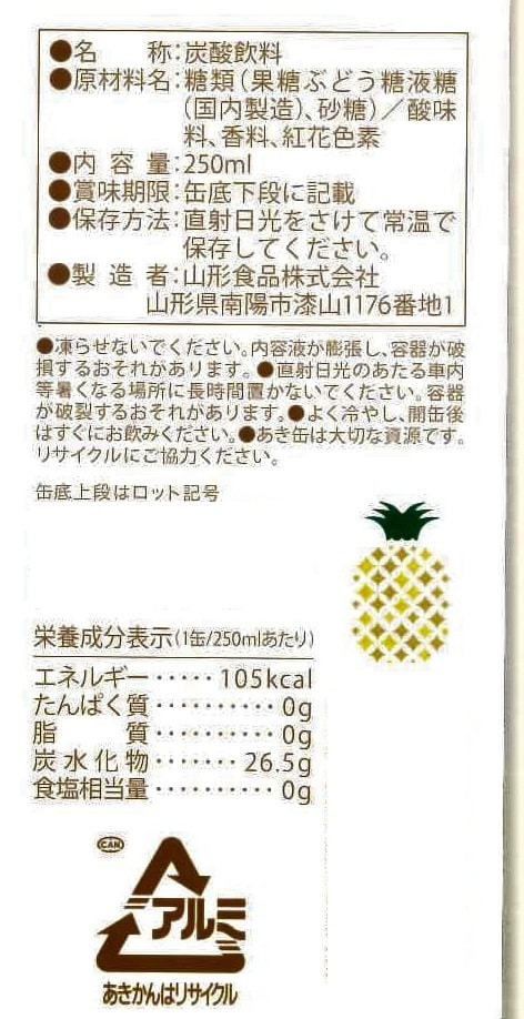 当時、山形ではなかなか口にできない南国のフルーツ「パイナップル」への憧れから誕生したと言われており、 現在でも山形のご当地サイダーとして根強い人気を誇っています。