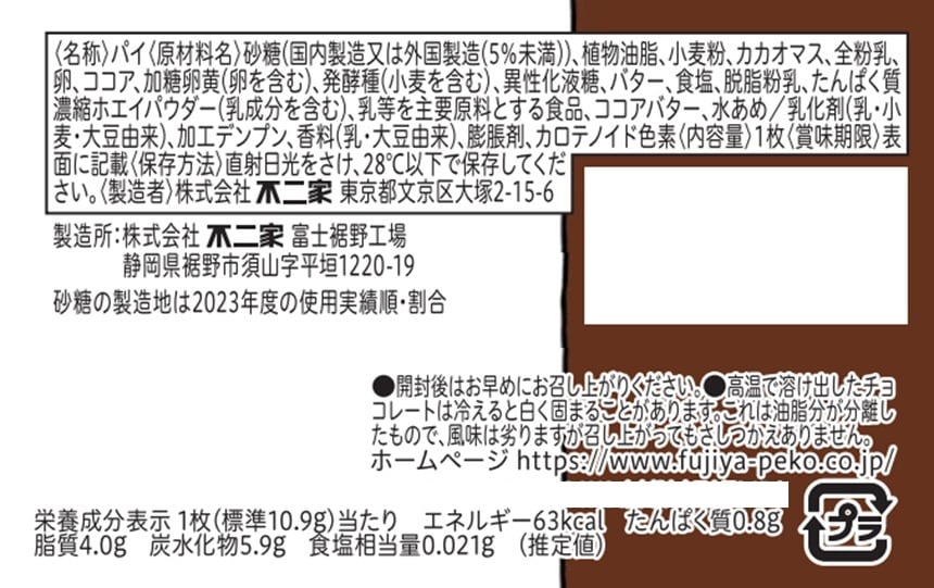 オランダ産ココアを練り込み400積層のサクサク食感に仕上げたチョコパイ生地と、ココアを配合したくちどけの良いチョコクッキー生地を重ね合わせて焼き上げ、仕上げにカカオ分22%の甘さを抑えたチョコレートでフルコーティング。