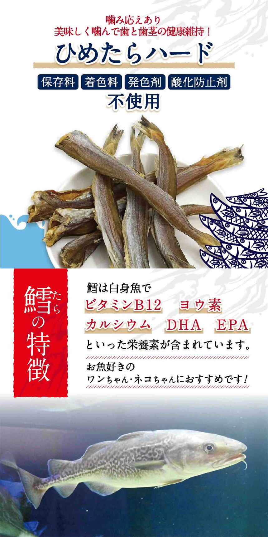 鱈は白身魚で高たんぱくな食材でビタミンB12やヨウ素・カルシウム・DHA・EPAといった栄養素が豊富に含まれています。噛み応えのあるひめたらハードタイプ。
