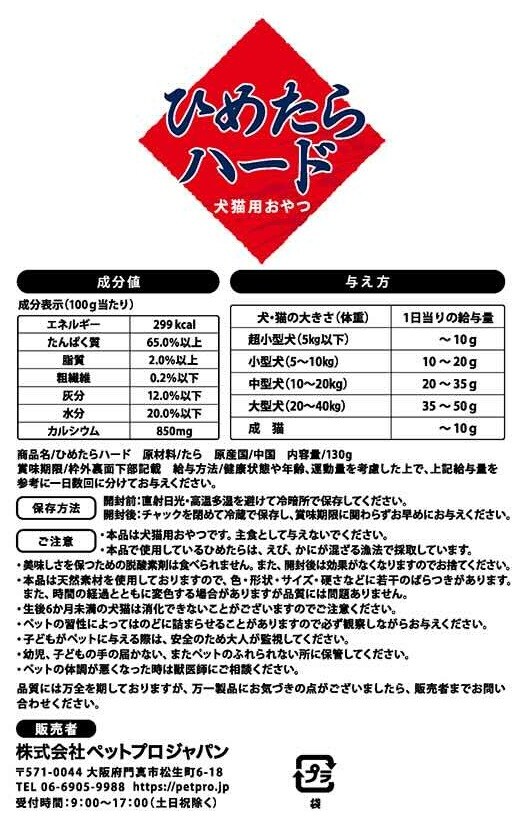 [5個]ペットプロジャパン ペットプロ ひめたらハード 130g | カルシウム・DHA・EPAが豊富なひめたら