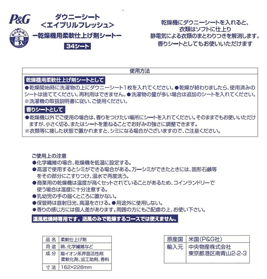 - P&G ダウニーシート エイプリルフレッシュ(乾燥機用柔軟仕上げ剤シート) 34枚入