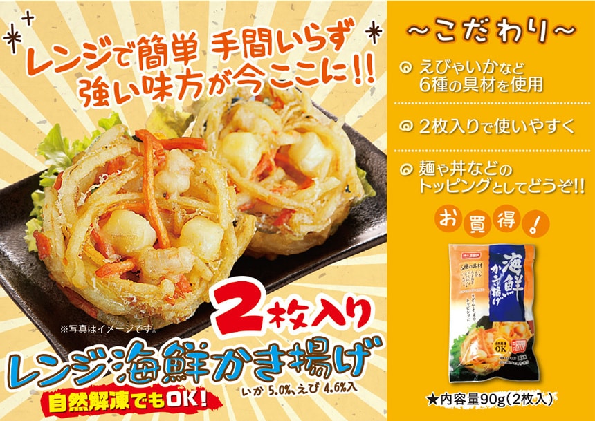 6種の具材(たまねぎにんじんじゃがいもいんげんいかえび)を使用した自然解凍やレンジで簡単に調理できるかき揚げです。