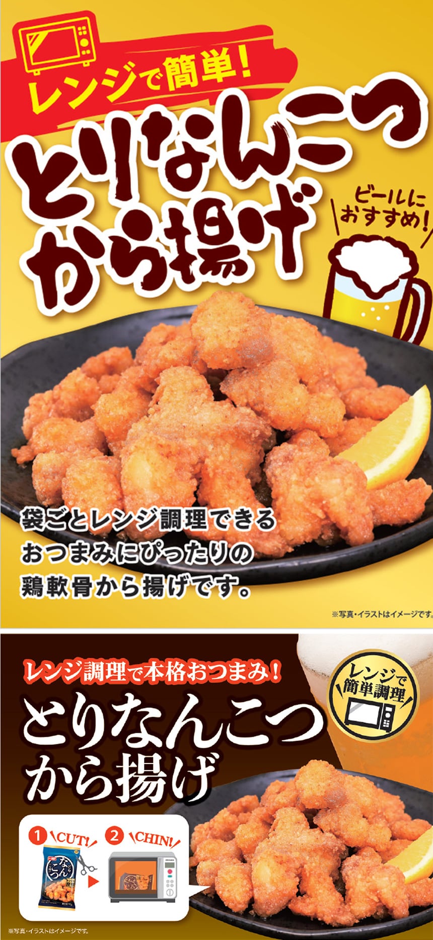 袋ごとレンジで温めて調理できるおつまみにもピッタリの鶏軟骨から揚げです。