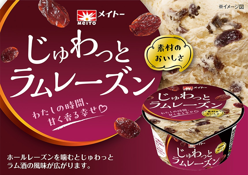 洋酒と砂糖でじっくり煮込み味わいが染みたホールレーズンを混ぜ込んだラムレーズンいりカップアイス。レーズンを噛むとじゅわっとラム酒の風味が広がります。アイス部分にはパンチのあるオールドジャマイカラム酒を使用。奥深いラム酒の余韻が後味として広がります。樫の樽で永く熟成されたラム特有の甘い香りキレの良さが特長です。洋酒の味わいがしっかりと感じられる大人の味わい。