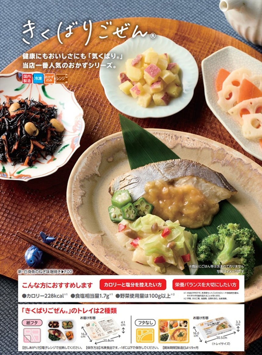 きくばりごぜんシリーズは1食あたり カロリー300kcal以下、塩分2.0g以下、野菜使用量100g以上の冷凍総菜セットです。
