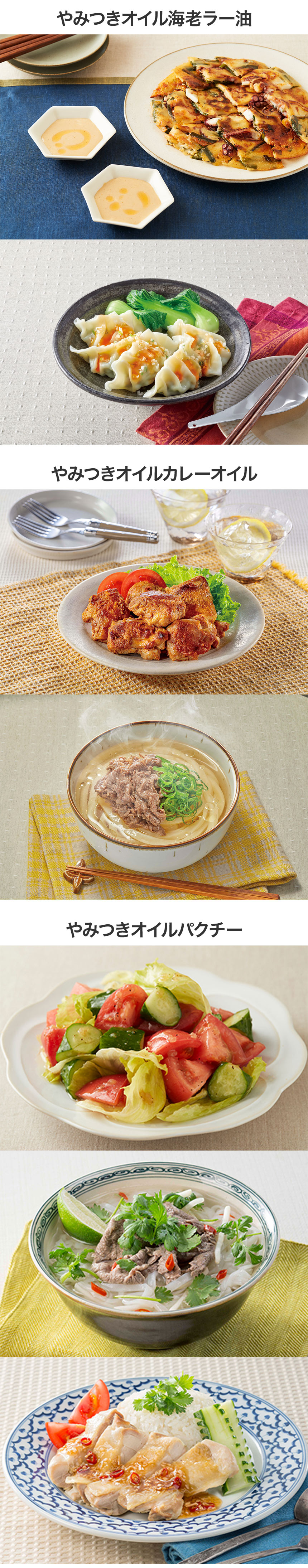 日清やみつきオイルは、いつもの料理を、かけるだけで簡単にみんなが大好きな「やみつき味」にしてしまう調味料です。