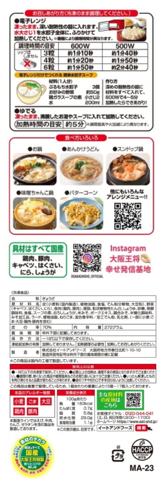 - [冷凍]イートアンドフーズ 大阪王将 ぷるもち水餃子 272g×10袋