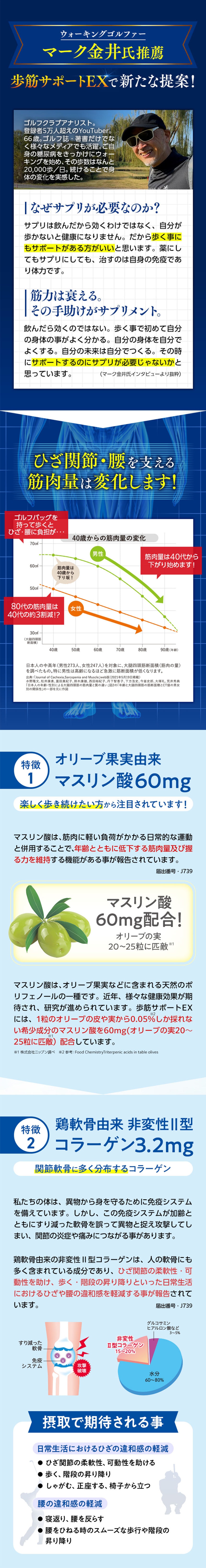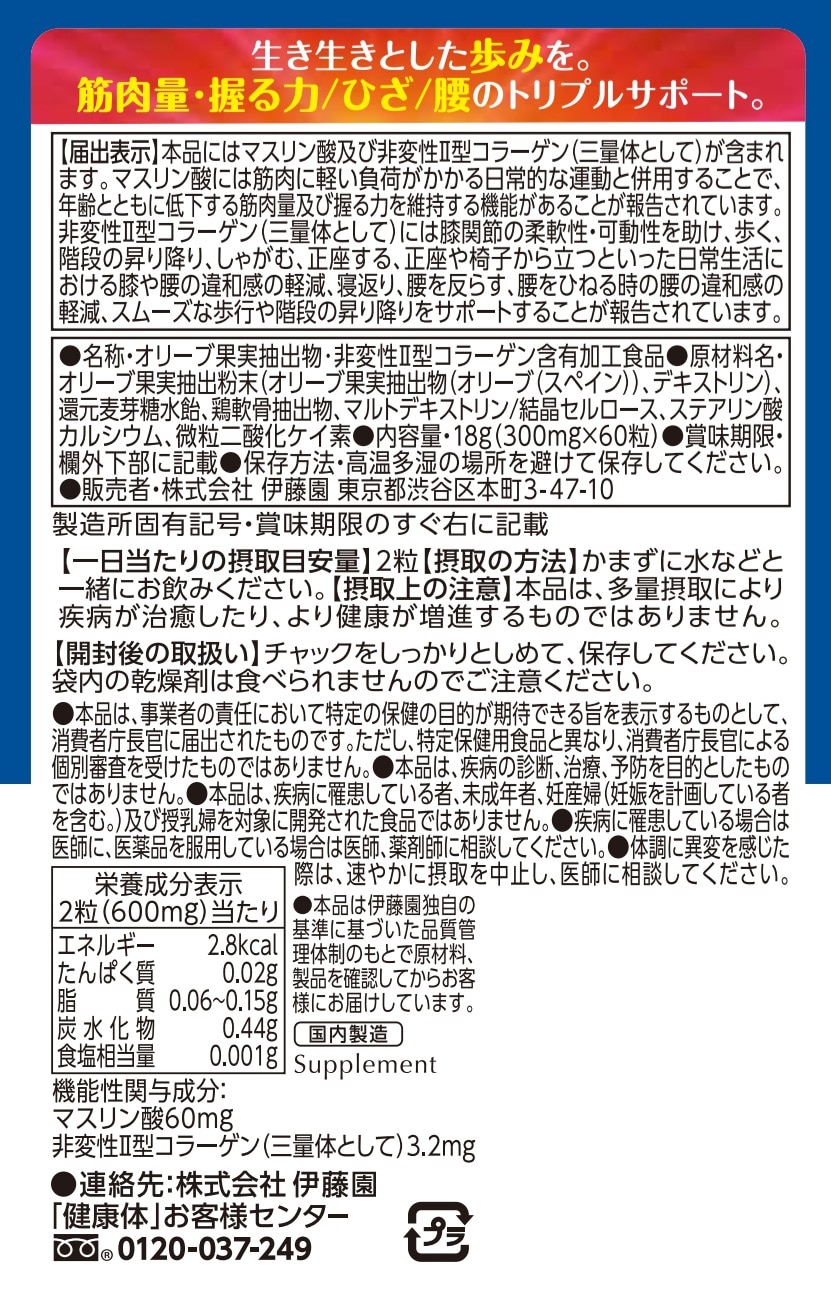 ■届出表示:本品にはマスリン酸及び非変性II型コラーゲン(三量体として)が含まれます。マスリン酸には筋肉に軽い負荷がかかる日常的な運動と併用することで、年齢とともに低下する筋肉量及び握る力を維持する機能があることが報告されています。非変性II型コラーゲン(三量体として)には膝関節の柔軟性・可動性を助け、歩く、階段の昇り降り、しゃがむ、正座する、正座や椅子から立つといった日常生活における膝や腰の違和感の軽減、寝返り、腰を反らす、腰をひねる時の腰の違和感の軽減、スムーズな歩行や階段の昇り降りをサポートすることが報告されています。