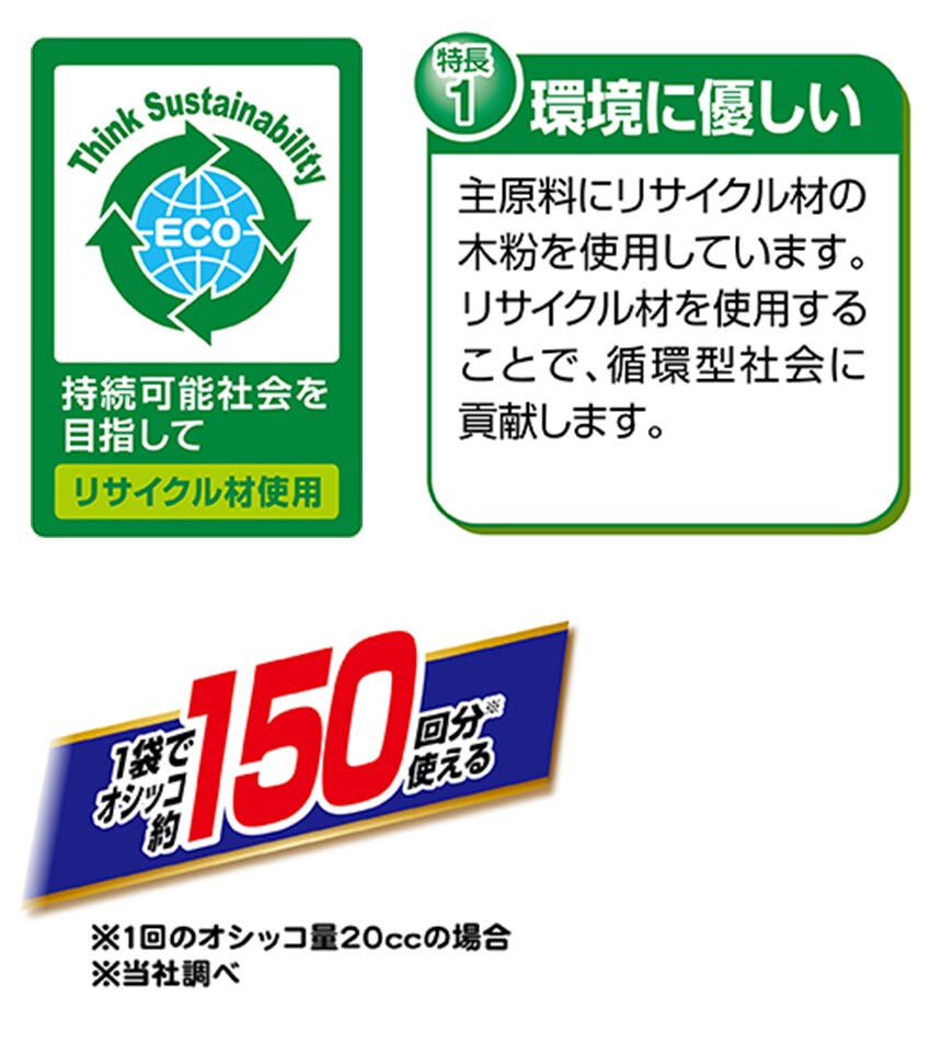 ガッチリ小さく固まるので経済的。木の成分のフィトンチッドによる消臭効果があります。可燃ゴミとしても処理できます。