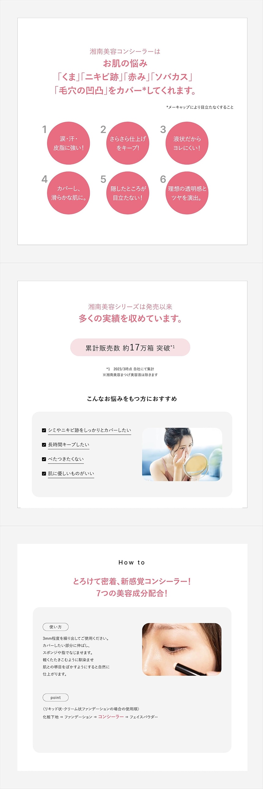 湘南美容コンシーラーは、お肌の悩み「くま」「ニキビ跡」「赤み」「ソバカス」「毛穴の凹凸」をカバー※してくれます。