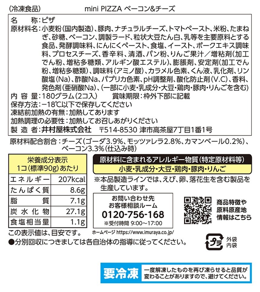- [冷凍]井村屋 mini PIZZA ベーコン&チーズ 2個入×5袋