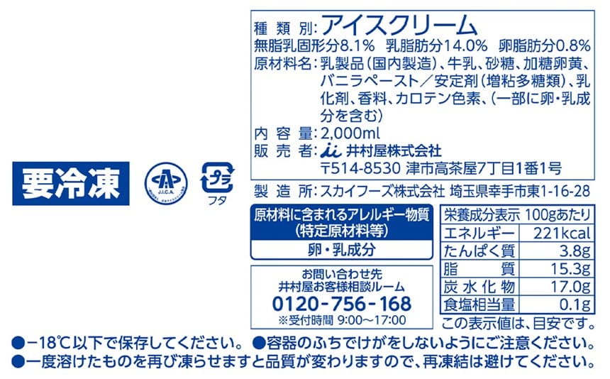 ※アイスクリーム類は、-18度以下での冷凍保存の状態では、品質の劣化が極めて小さい食品ということで、賞味期限の設定がされておりません。