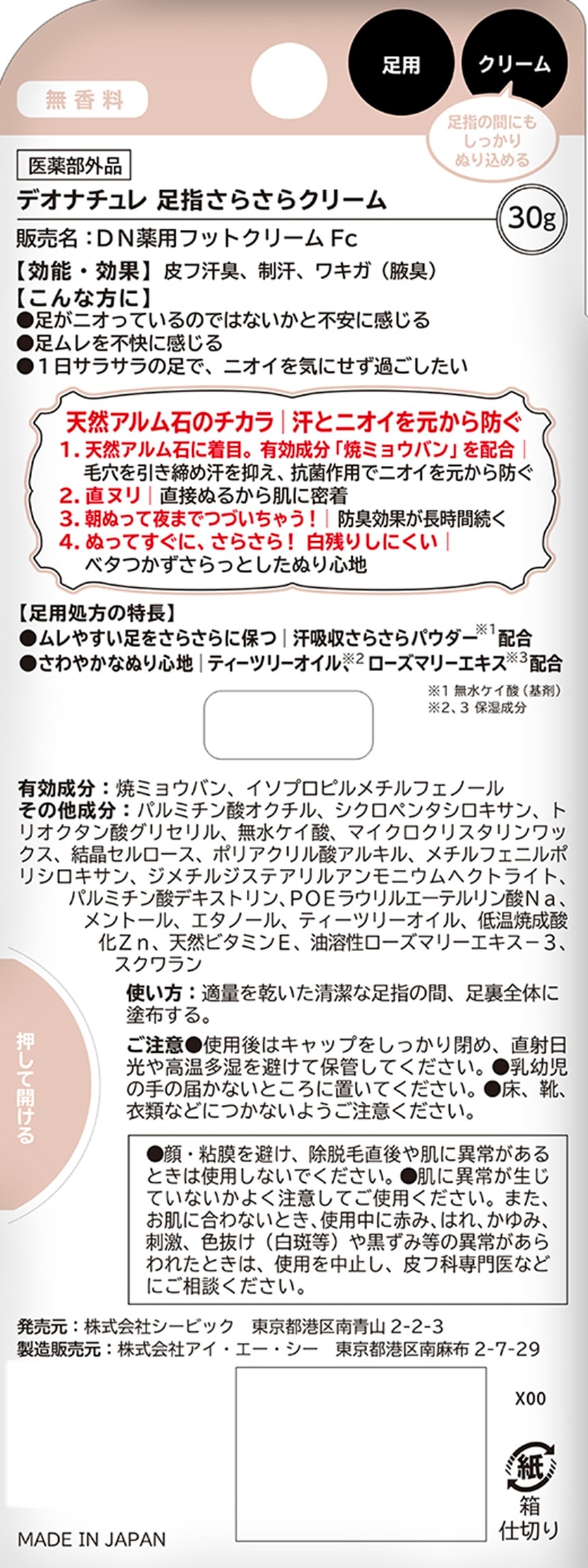 [3個]【医薬部外品】シービック デオナチュレ 足指さらさらクリーム 30g | 足特有のムレニオイを防ぐ、クリームタイプの制汗剤