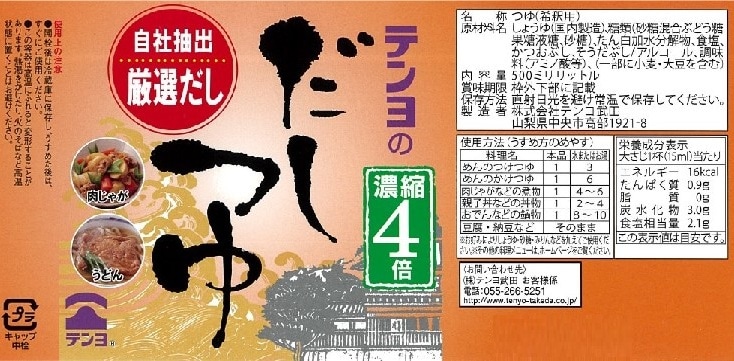テンヨの本醸造しょうゆにかつお節を加えて仕上げた、濃縮4倍の少し濃いつゆです。