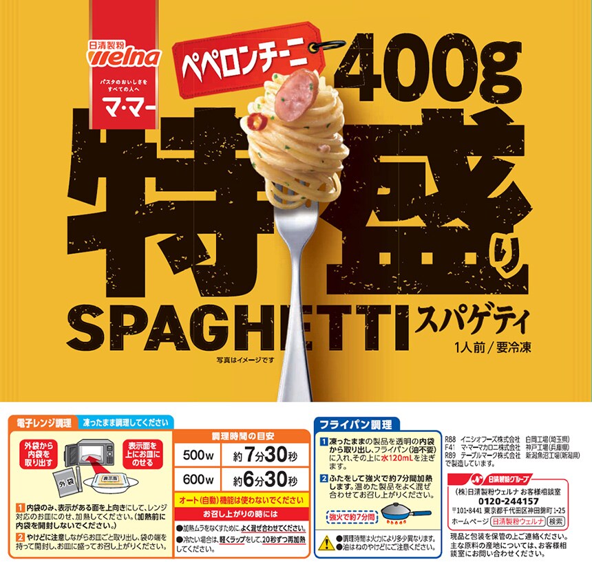 - [冷凍]日清製粉ウェルナ マ・マー 特盛りスパゲティ ペペロンチーニ 400g×12個