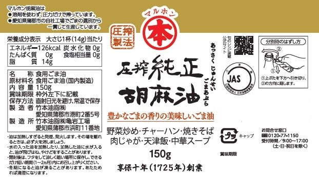 [10本]竹本油脂 マルホン 圧搾純正胡麻油 150g