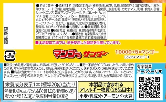 [320個]有楽製菓 マンゴーのサンダー | マンゴーとほんのりビターなチョコのハーモニーに加えザクザク食感を楽しめるので、ちょっと元気になれるチョコバーです。