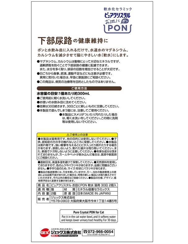 [3個]ジェックス CA事業部 ピュアクリスタル お皿にPON 軟水 猫用 30日 2個入 | 下部尿路の健康維持に大切なネコちゃんのために