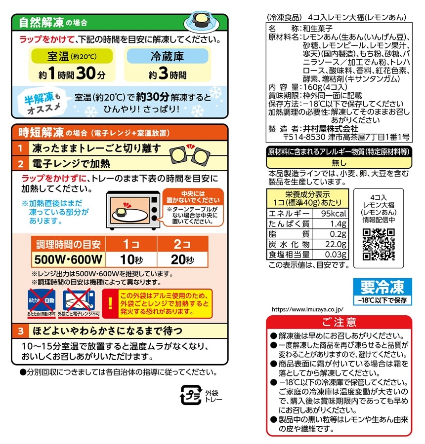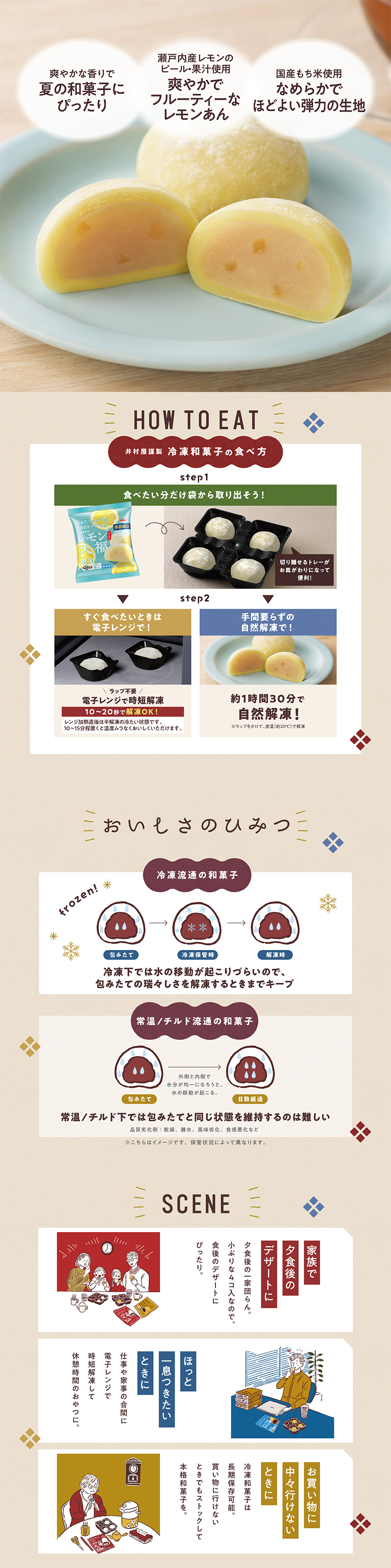 レモンあんには、柔らかな酸味と程よい甘み、爽やかな香りが特徴の瀬戸内産のレモンピール・果汁を使用しており、生地には、もちの風味が穏やかな国内産もち粉を使用しており、程よい弾力ともち感で、レモンあんがしっかりと楽しめます。