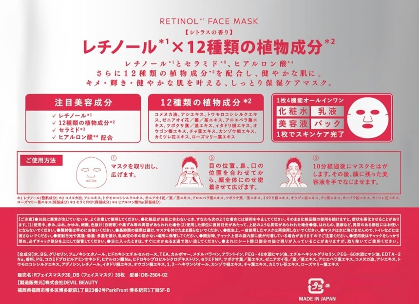 [計90枚]DEVIL BEAUTY レチノールフェイスマスク 30枚入×3個 | レチノール配合のフェイスマスクで肌にキメと輝きを与え、潤う健やかな肌へ
