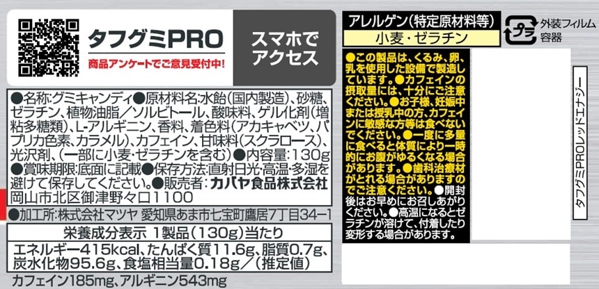 [6個]カバヤ食品 タフグミ PRO カフェイン レッドエナジー 130g | 目を覚ませ。ボトル容器入りでカフェイン・アルギニンを配合したエナジードリンクフレーバーの「タフグミ」