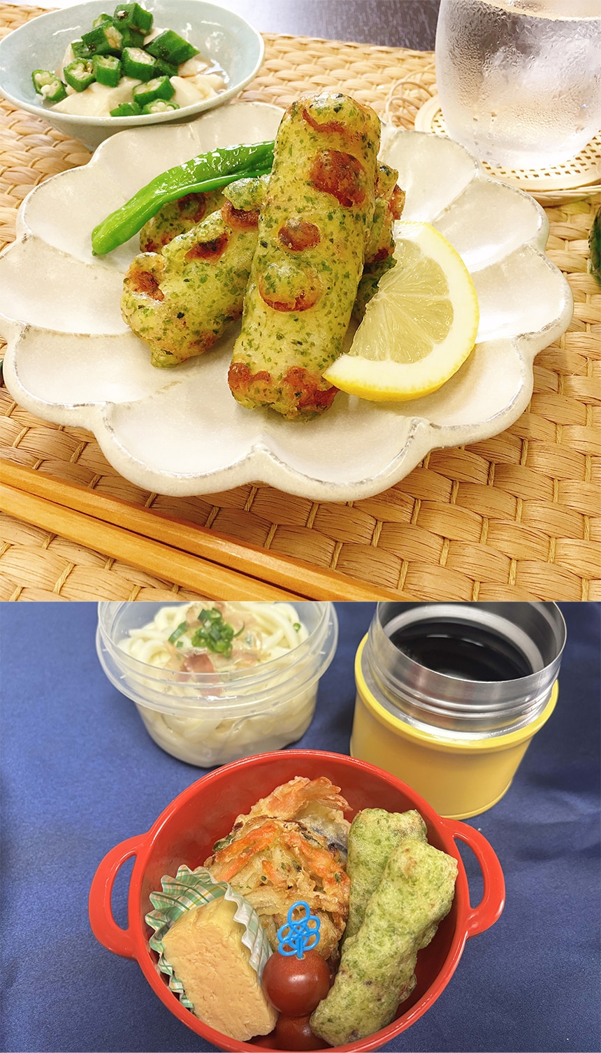 磯辺揚げ専用配合のちくわを縦割りにして、青さたっぷりの衣をつけて磯辺揚げにしました。お弁当や、そば・うどんのトッピング、おつまみにも使いやすいサイズです。レンジアップだけでも、油で揚げても、自然解凍でも召し上がれます。