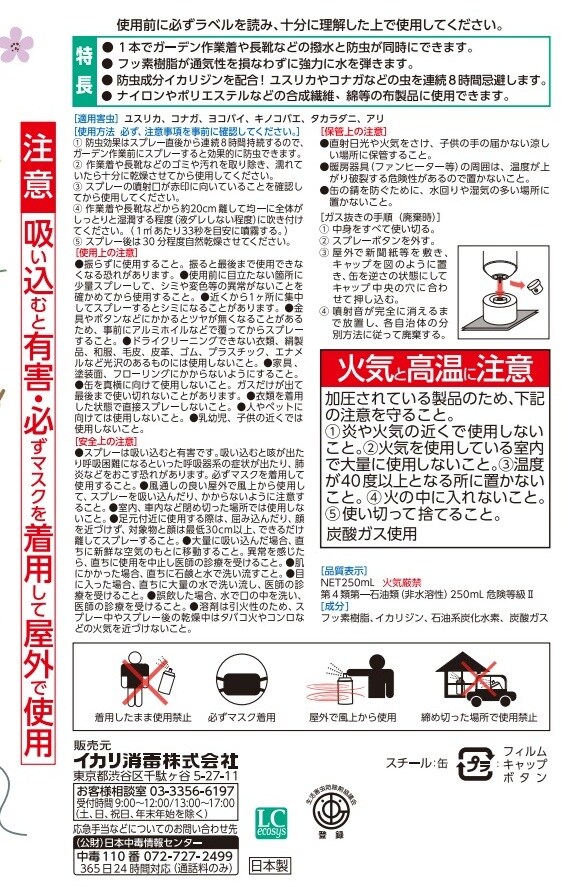 衣類や傘、テントに使える強力な撥水成分と虫よけ効果の高いイカリジンを配合したスプレーです。撥水成分は通気性を損なわなず強力撥水できるフッ素樹脂を使用。虫よけ成分のイカリジンは繊維を傷めにくいやさしい処方でしっかりとガードします。