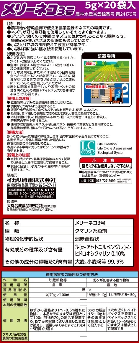 [10個] <農薬> イカリ消毒 殺鼠剤 メリーネコ3号 20袋入 | 野ネズミ退治できる殺鼠剤