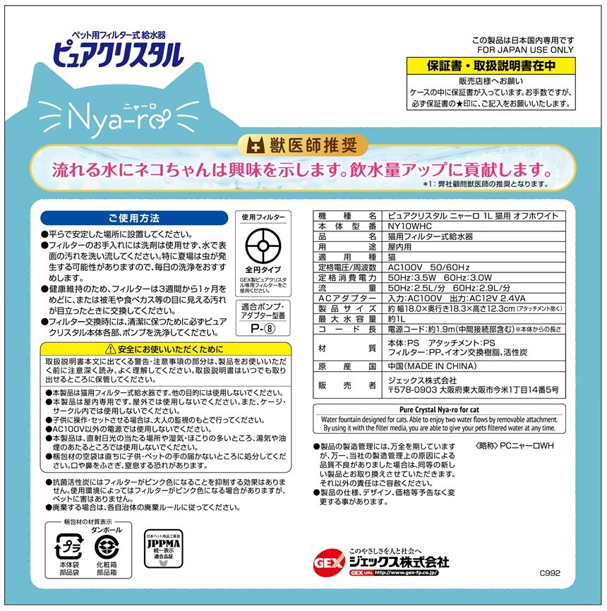 [1個]ジェックス CA事業部 ピュアクリスタル ニャーロ 1L 猫用 オフホワイト | いつでも清潔でおいしい水を