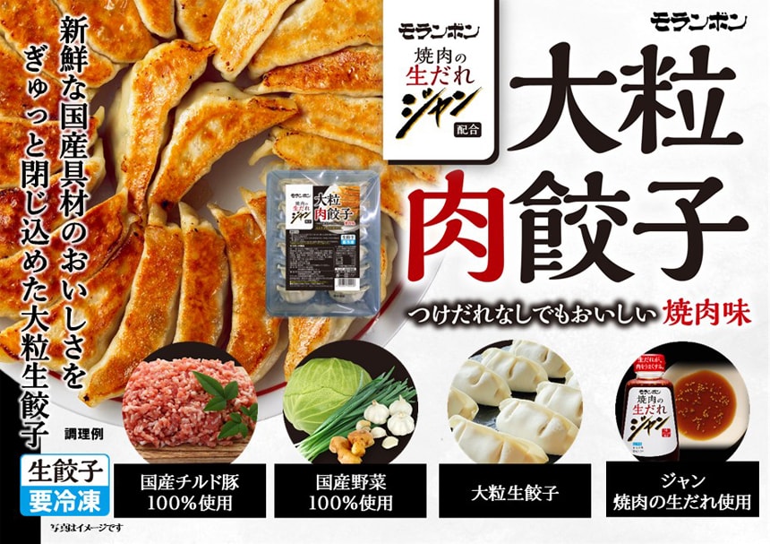 国産豚肉・野菜使用、ジャン焼肉の生だれを配合し、つけだれなしでもおいしい大粒餃子。