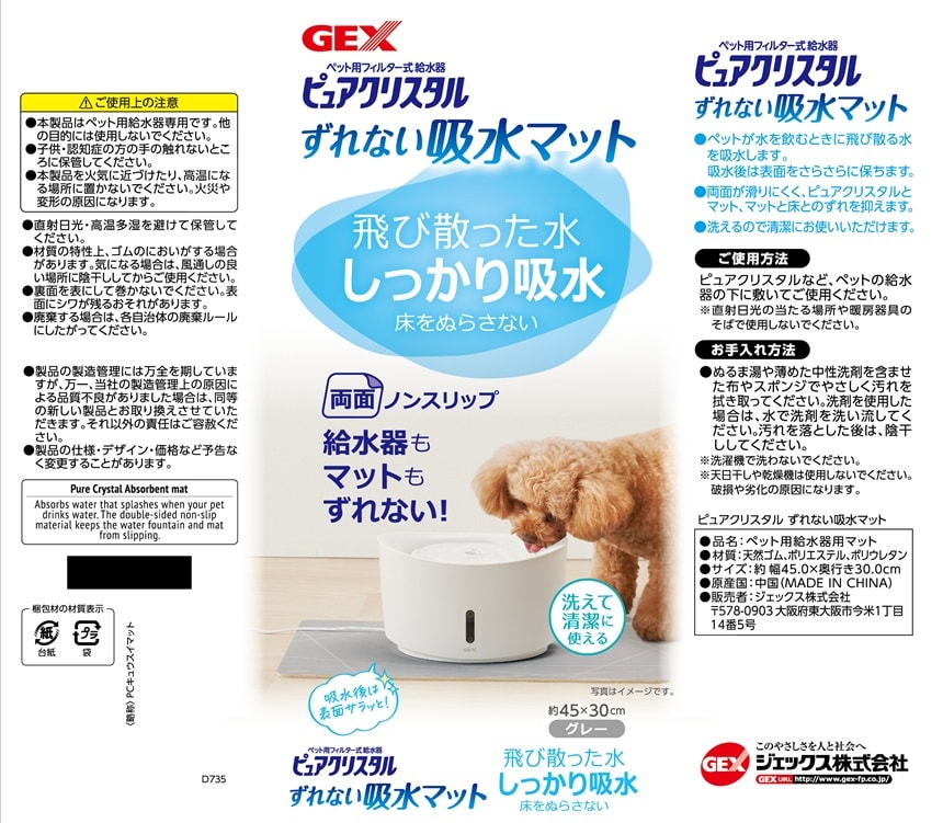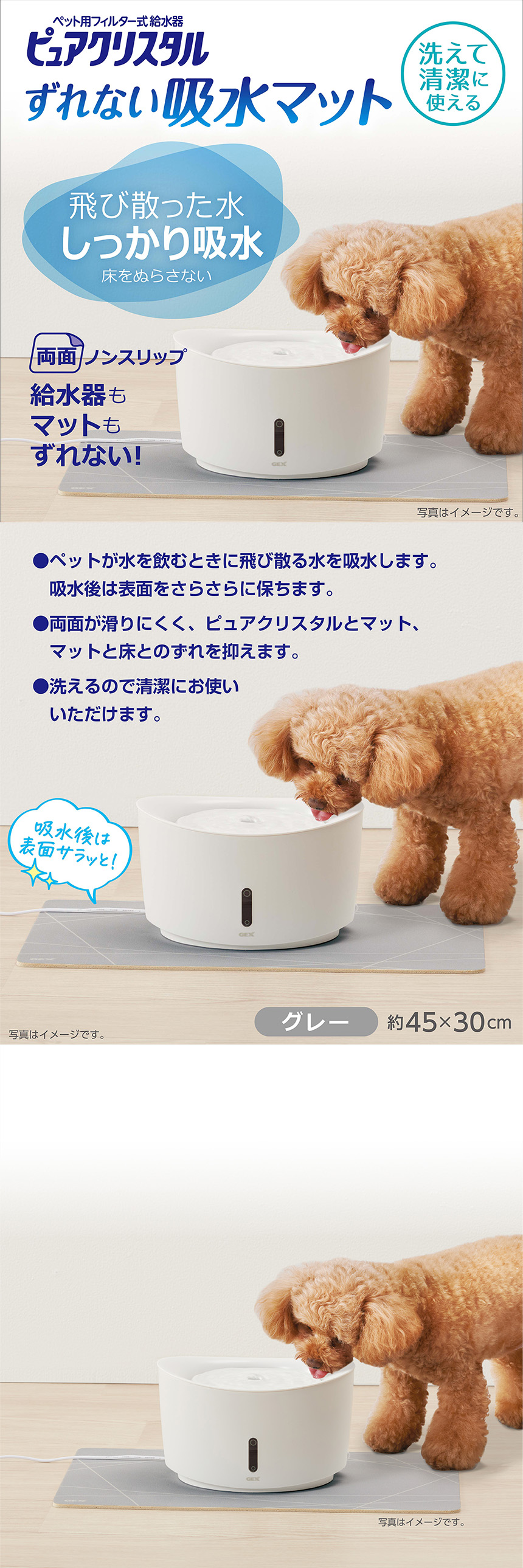 ・ペットが水を飲むときに飛び散る水を吸水します。給水後は表面をさらさらに保ちます。