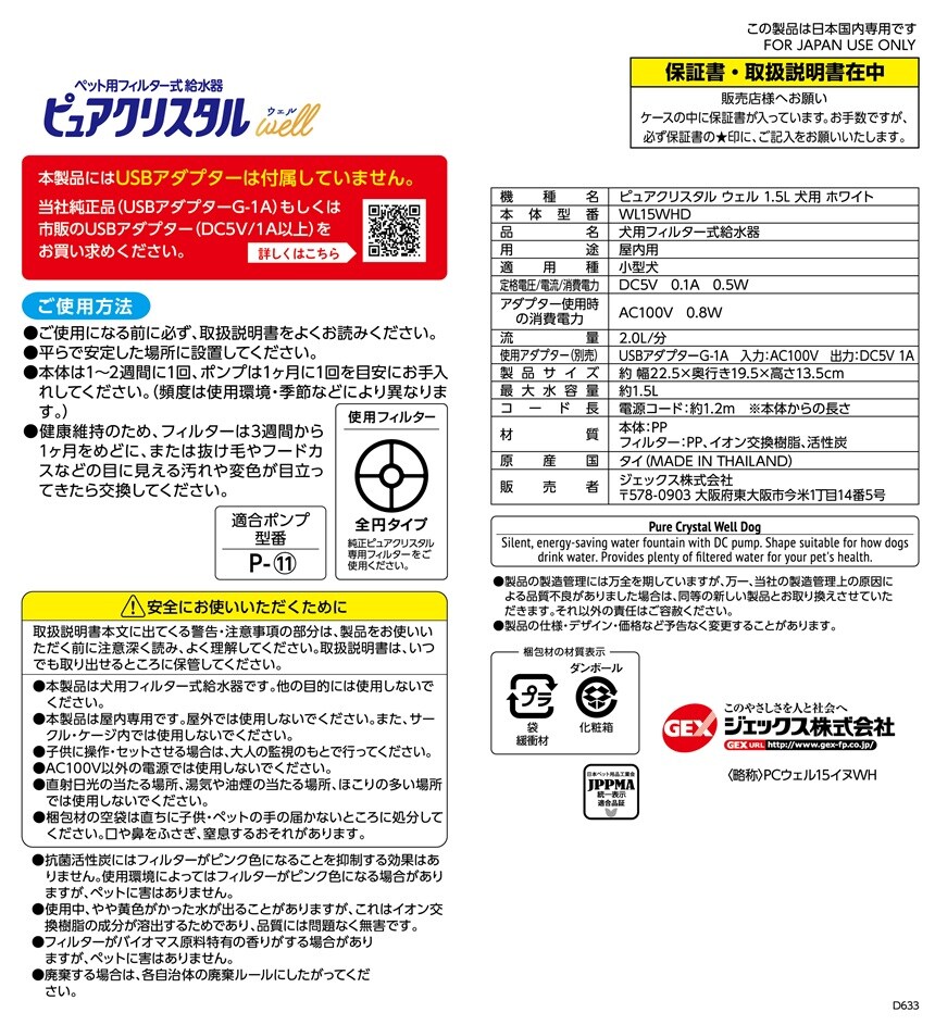 [2個]ジェックス CA事業部 ピュアクリスタル ウェル 1.5L 犬用 ホワイト | いつでも清潔でおいしい水を!