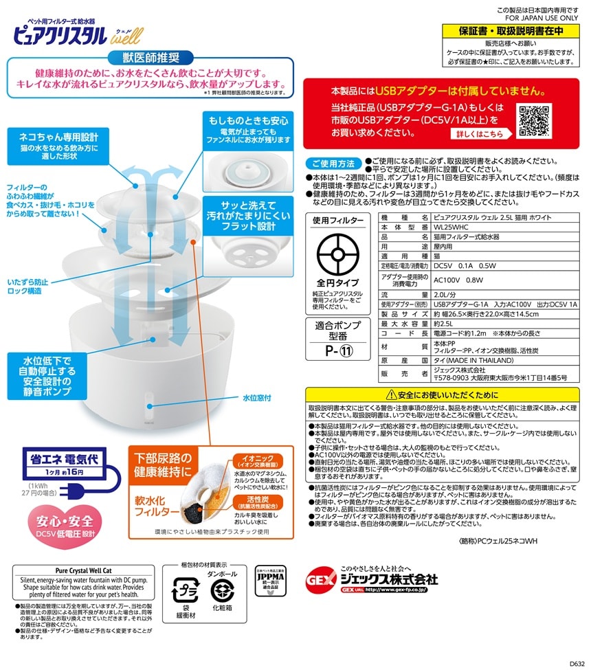 [2個]ジェックス CA事業部 ピュアクリスタル ウェル 2.5L 猫用 ホワイト | いつでも清潔でおいしい水を!