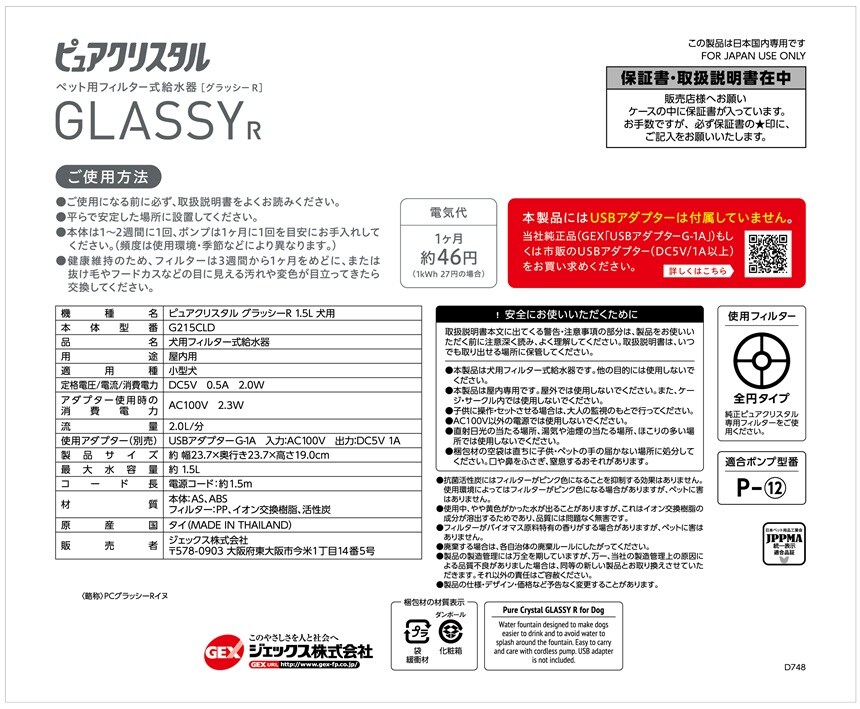 [1個]ジェックス CA事業部 ピュアクリスタル グラッシーR 1.5L 犬用 | いつでも清潔でおいしい水を!