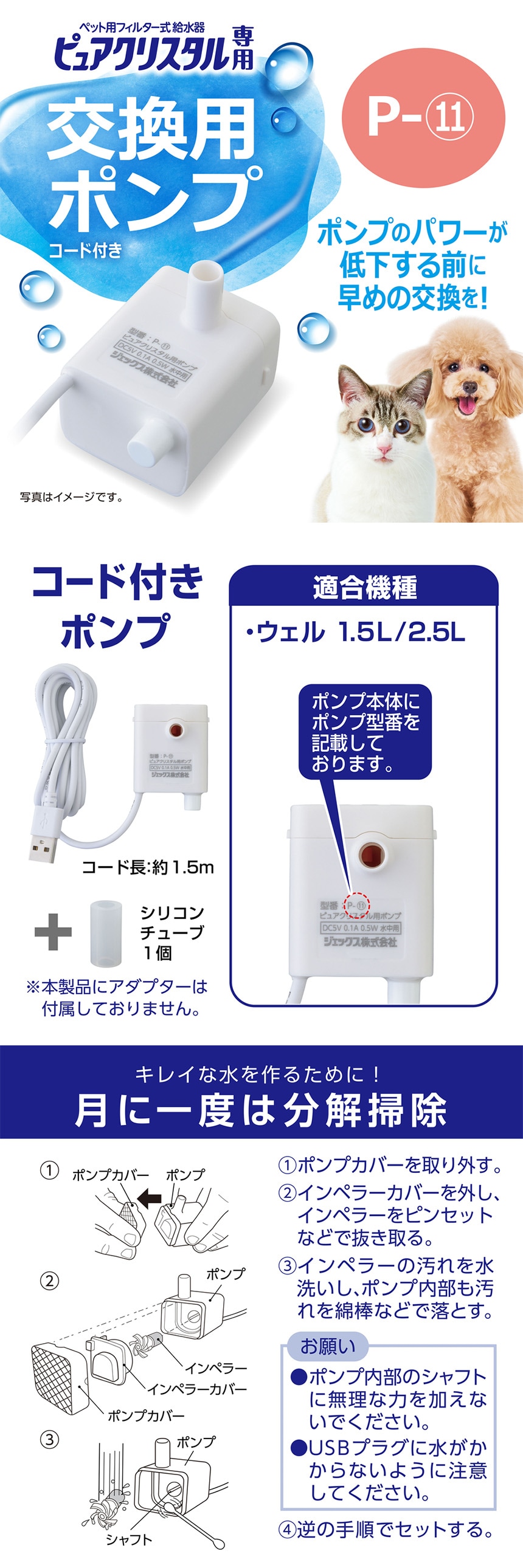 ・ペット用フィルター式給水器ピュアクリスタルの交換用ポンプ(コード付)です。