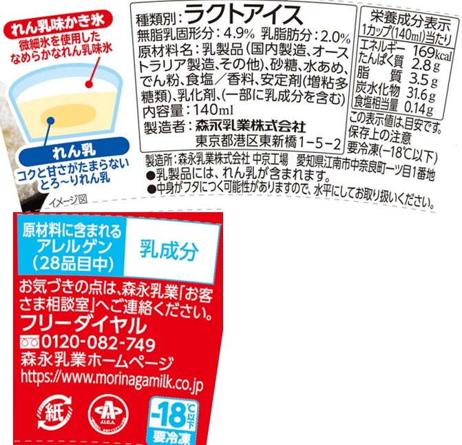 濃厚でコクがあるれん乳の味わいが楽しめる「森永れん乳」の定番商品です。れん乳味のかき氷に、更にれん乳を充填。さじ通りの良い微細氷を使用し、ふわっとなめらかな食感を実現しました。