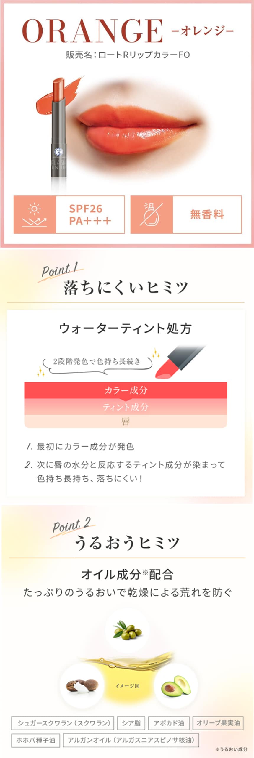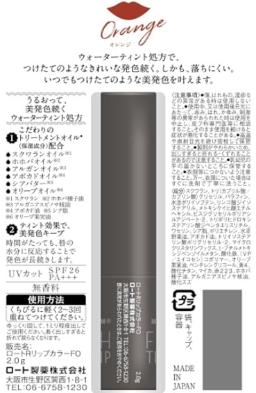 ウォーターティント処方を採用し、時間が経っても、唇の水分に反応することで発色が長続きする色つきリップです。UVカット(SPF26、PA+++)。無香料。