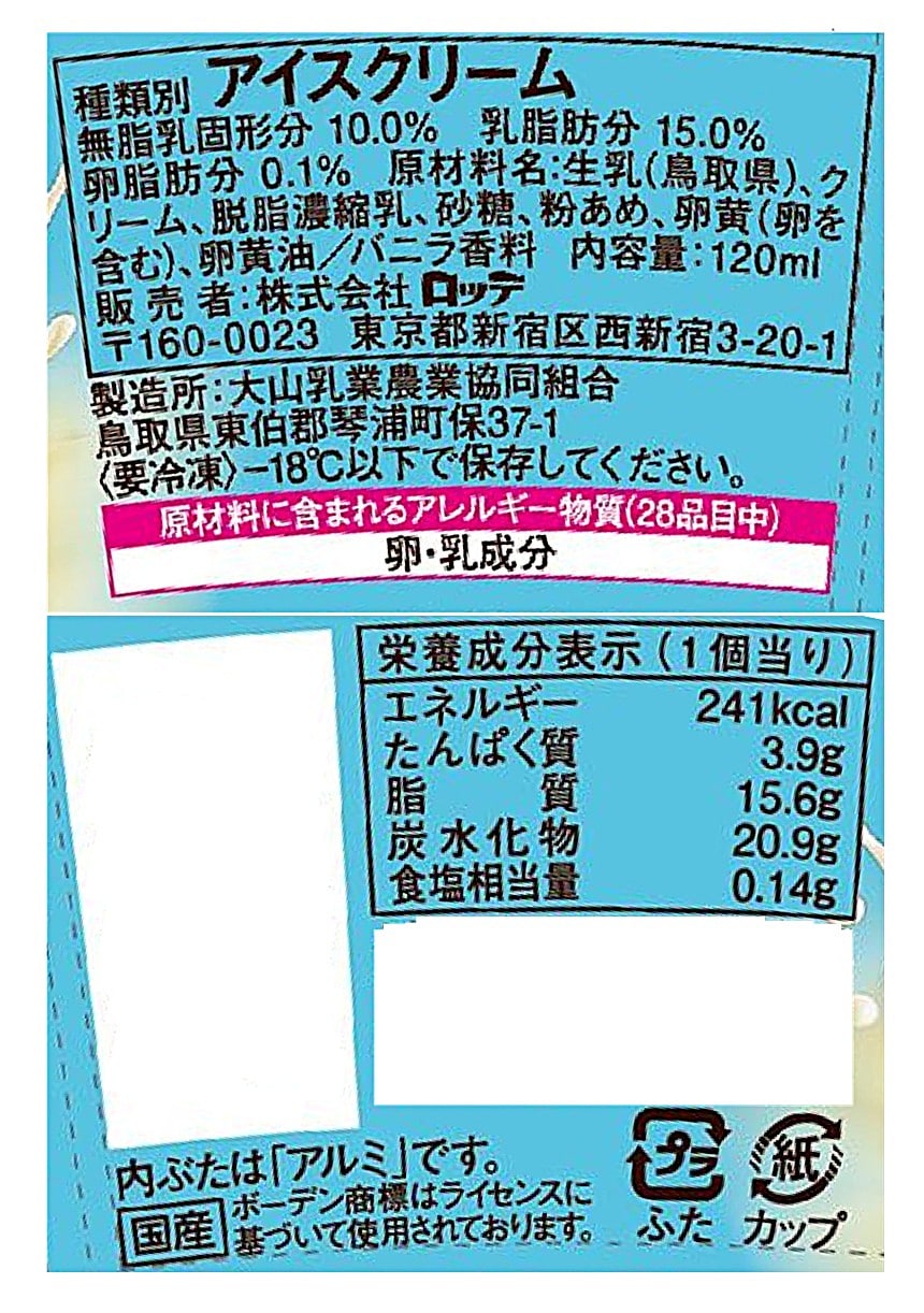 ※アイスクリーム類は、-18度以下での冷凍保存の状態では、品質の劣化が極めて小さい食品ということで、賞味期限の設定がされておりません。