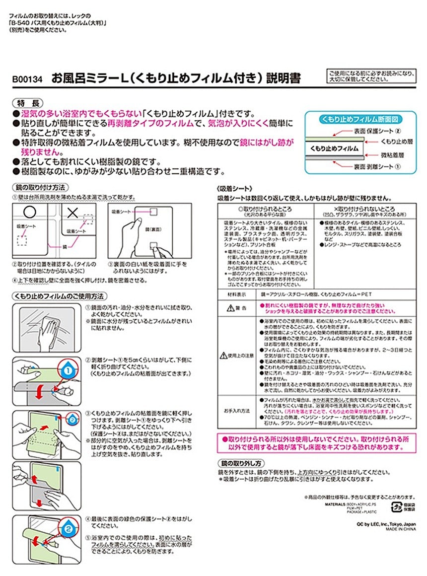 ●特許所得の微粘着フィルムを使用しています。糊不使用なので、鏡にはがし跡が残りません。