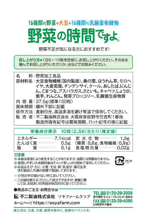 [5袋]不二製油 野菜の時間ですよ 37.5g(標準150粒) | バランスよく16種類の野菜が摂取できる。乳酸菌発酵物入り!