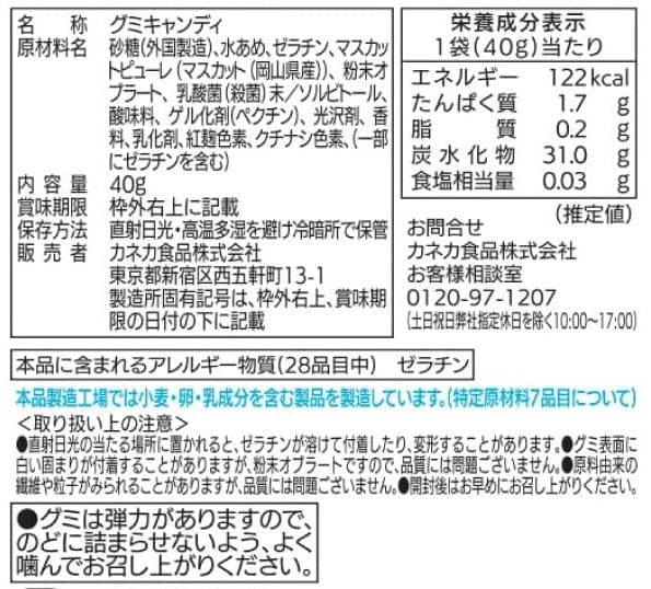 JA岡山×カネカ食品。岡山県産マスカット・オブ・アレキサンドリア果汁を使用した、芳醇な香りと濃厚な味わいのジュレをグミの中に閉じこめました。植物由来の「ラブレ乳酸菌」を1袋あたり24億個配合。