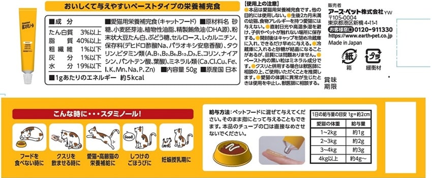 [5個]アース・ペット 猫用栄養補給ペースト スタミノール 食欲がないときに まぐろ味 50g 国産 | 愛猫の活発で健康な生活をサポート!よろこぶマグロ味で与えやすい栄養補給ペースト。