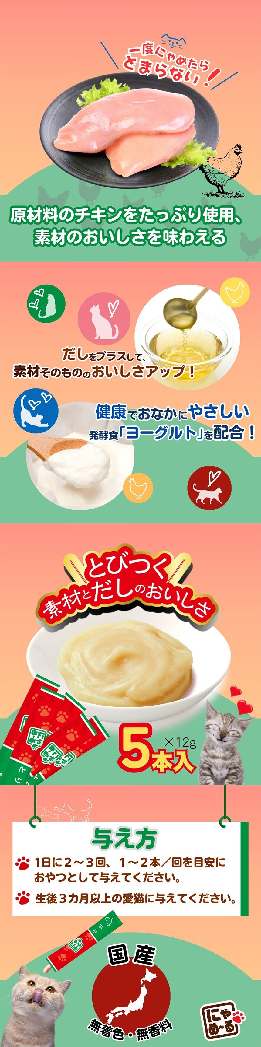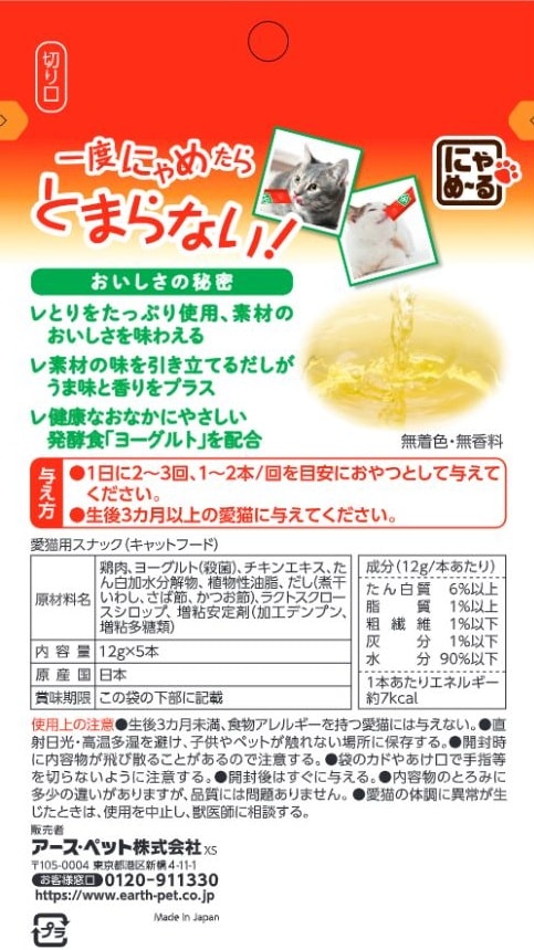 [24個]アース・ペット 猫用おやつ ねこモテ にゃめーる とり 国産 12g×5本 | 原材料をたっぷり使用!素材のおいしさを味わえる!だしをプラスして、素材そのもののおいしさアップ!