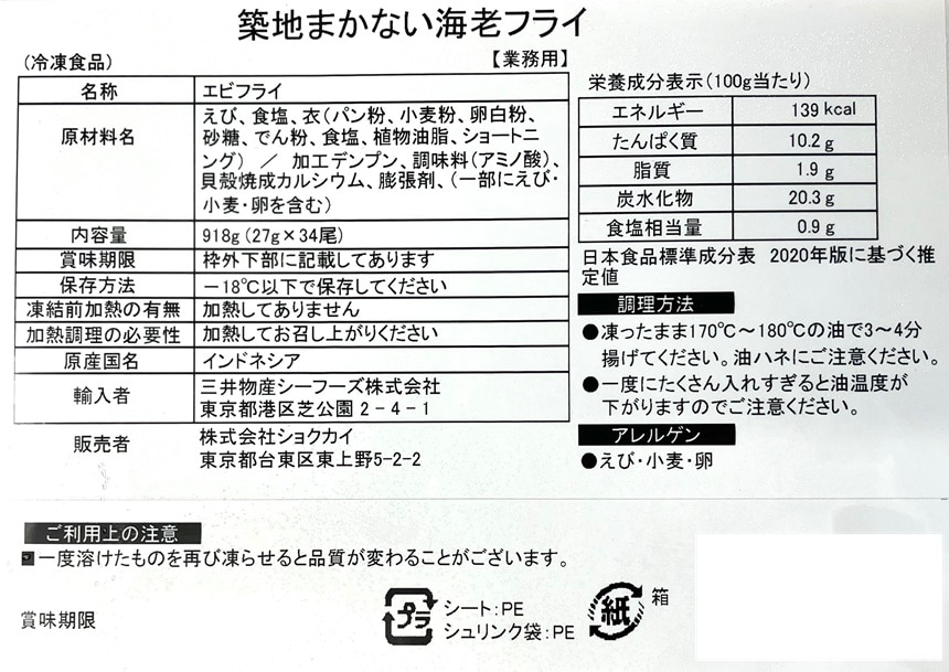 - [冷凍]【2箱】築地まかない海老フライ 27g×34尾