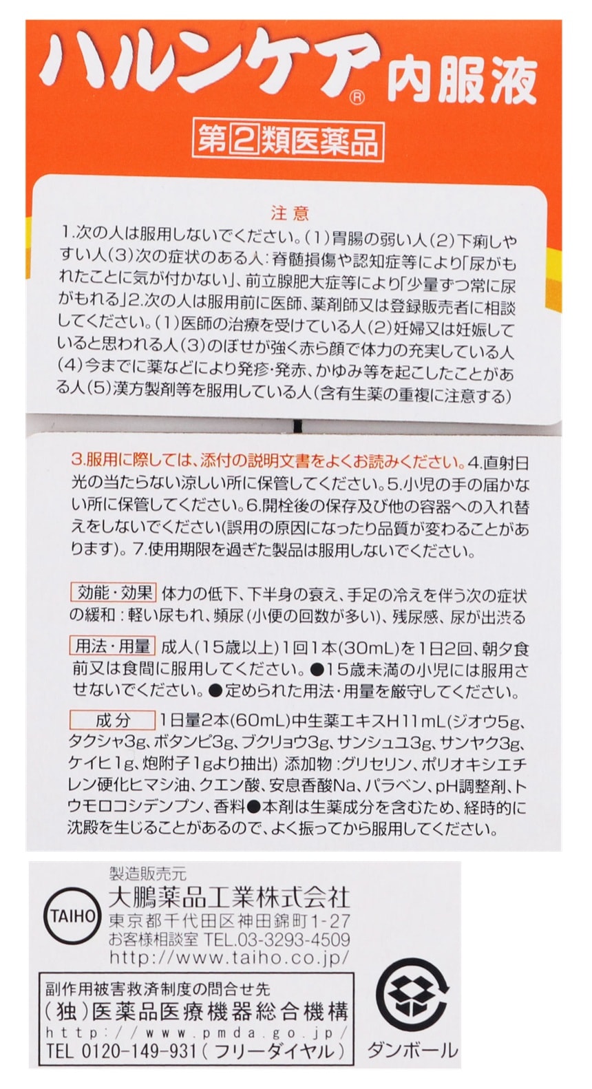 [計100本]【指定第2類医薬品】大鵬薬品工業 ハルンケア内服液 (30ml×10本)×10個 | 体力の低下、下半身の衰え、手足の冷えを伴う方の軽い尿もれ、頻尿の症状を緩和します。