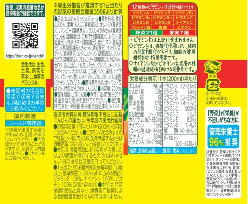 野菜と一緒に12種のビタミン(※2)が1日分摂れる栄養機能食品です。にんじんを主体に1食分の野菜(※3)と、オレンジなどの果実で、すっきりした味わいに仕上げました。