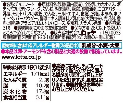 始めにチョコ感をしっかりと感じ、食感を楽しみながら噛み進めるとポテトパフの塩味・うま味によって、甘じょっぱいやみつき感を感じることが出来ます!