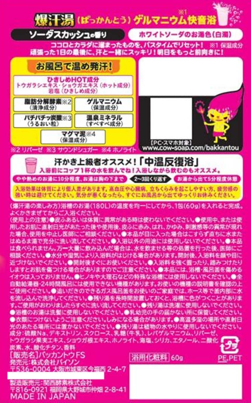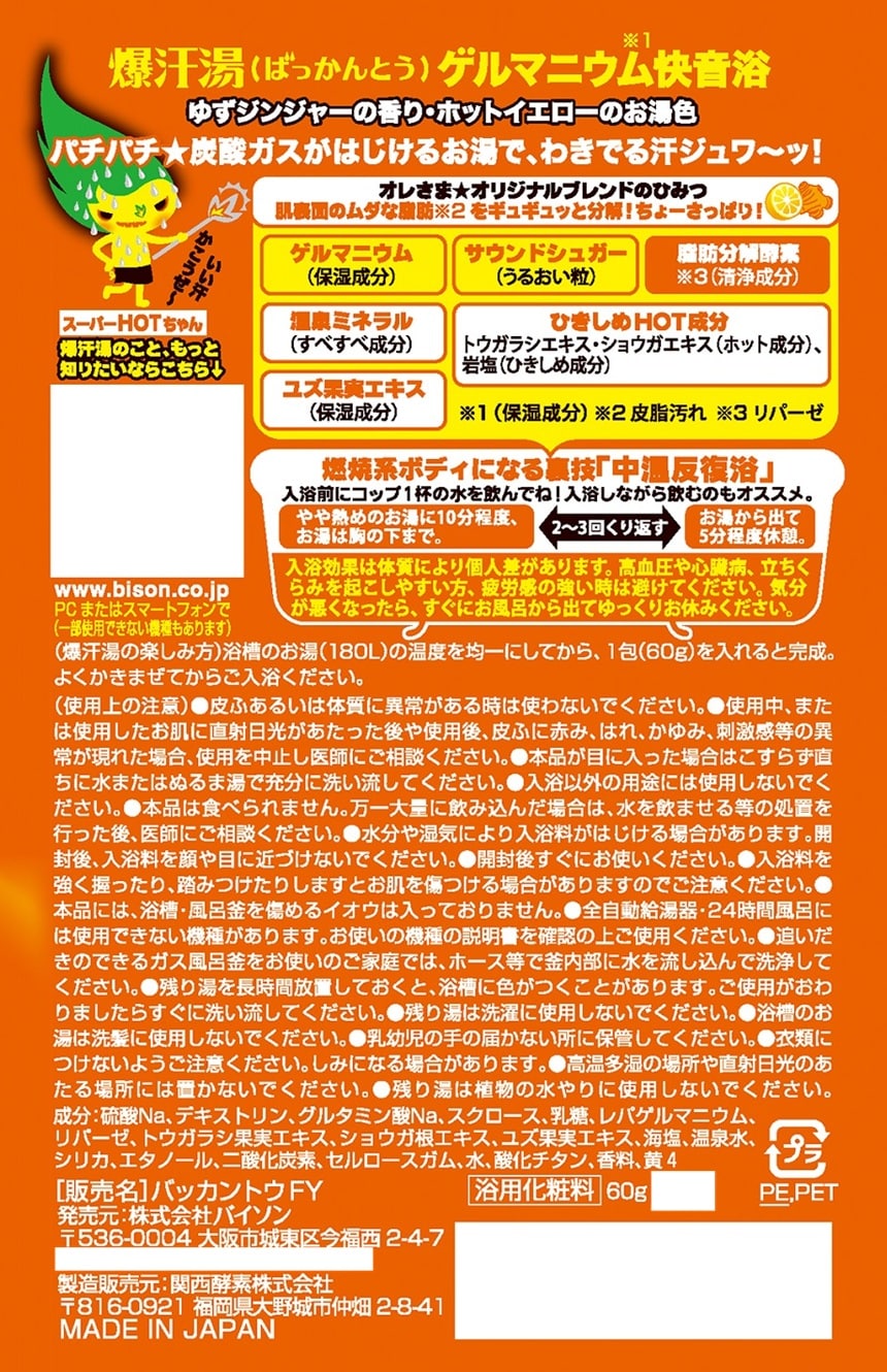 ●「爆汗湯 ホットジンジャーの香り 60g」は、ゲルマニウム入浴剤です。●さらにトウガラシエキス、ショウガエキス、岩塩、ガラナエキスを配合。●とろーり湯のラップ効果で汗をかくことで、お肌表面の汚れもすっきり。●すべすべ肌に。パチパチはじける炭酸ガスの楽しいサウンドとホットなお湯で、エキサイティングに汗だくに。ホットジンジャーの香り。