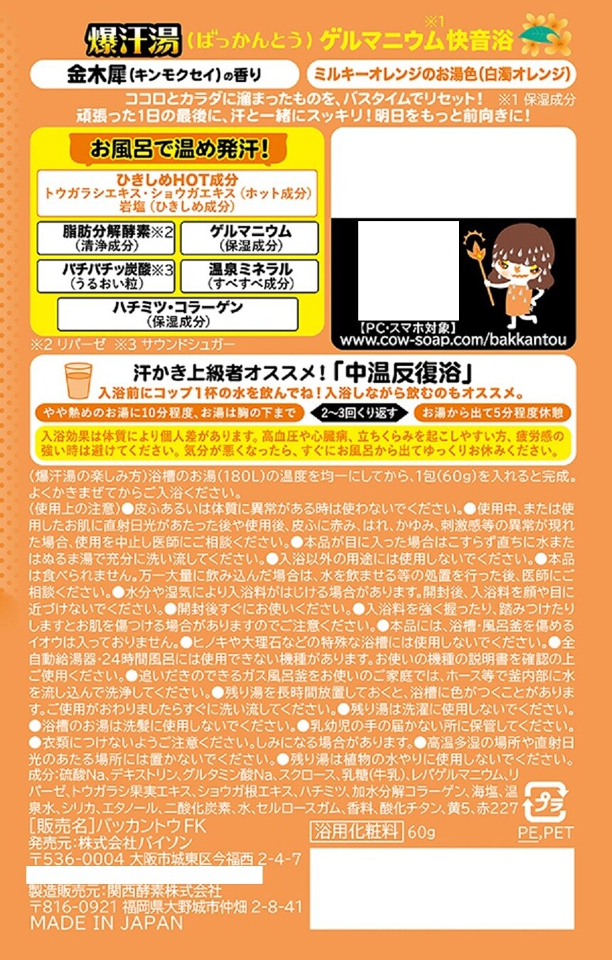 ●金木犀の香り。●ミルキーオレンジのお湯色。●引き締めHOT成分(トウガラシエキス、ショウガエキス、岩塩)でお風呂で温め発汗。